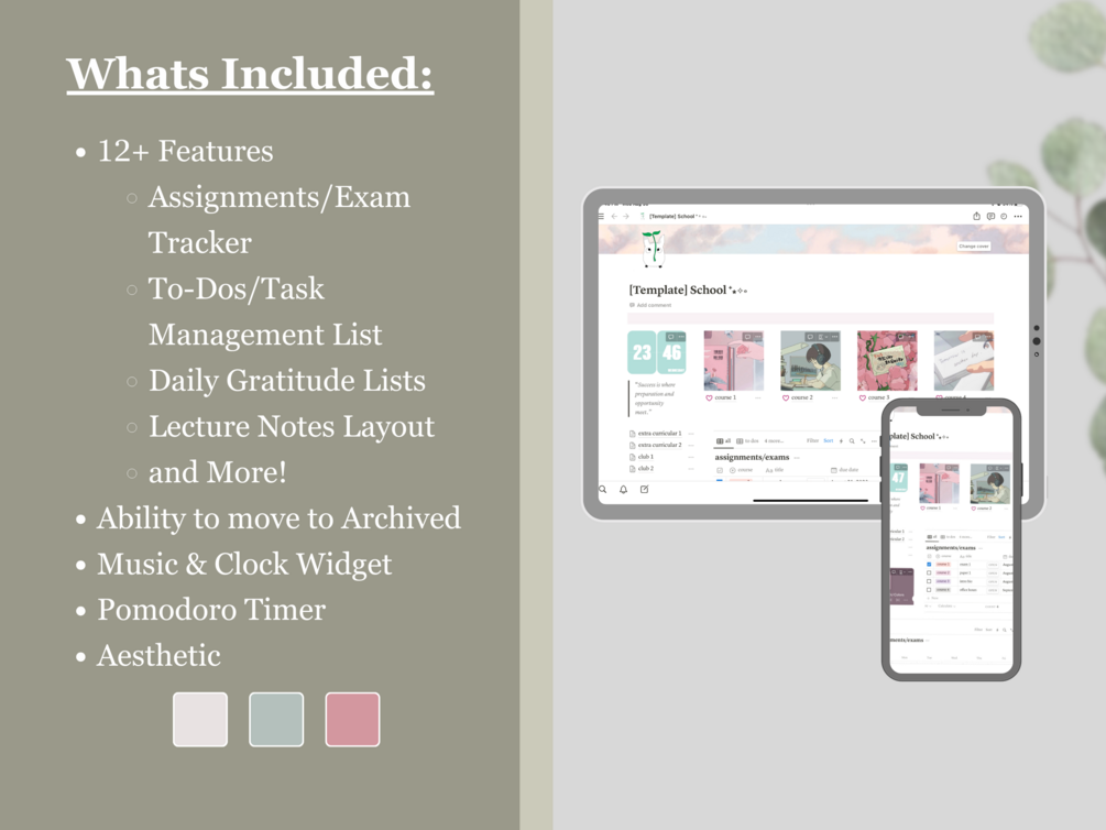 What's Included? : Assignment & Exam Tracker, Management List, To-Do List, Calendar Integration, Gratitude Journal, Notes Layout, Resource Repository, Progress Tracker, Data Visualization, and More!