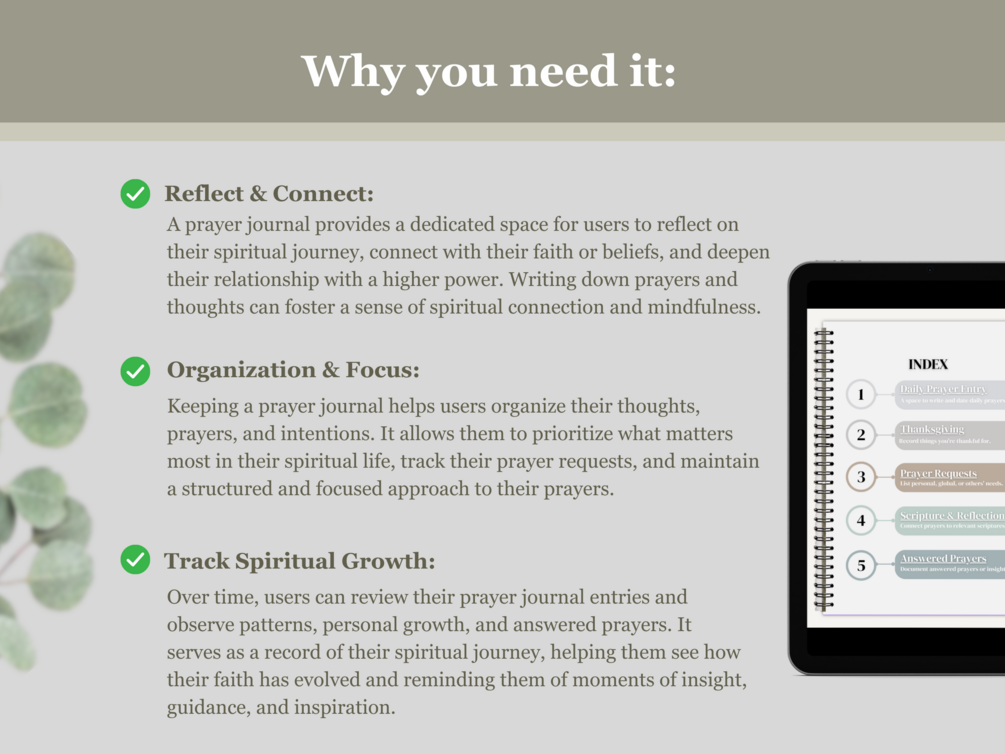 This Prayer Journal is more than just a notebook; it's a companion on your path to spiritual growth, mindfulness, and connection. Whether you're nurturing a daily prayer routine, seeking solace in gratitude, or tracking your spiritual journey, our journal is designed to support and inspire you every step of the way.