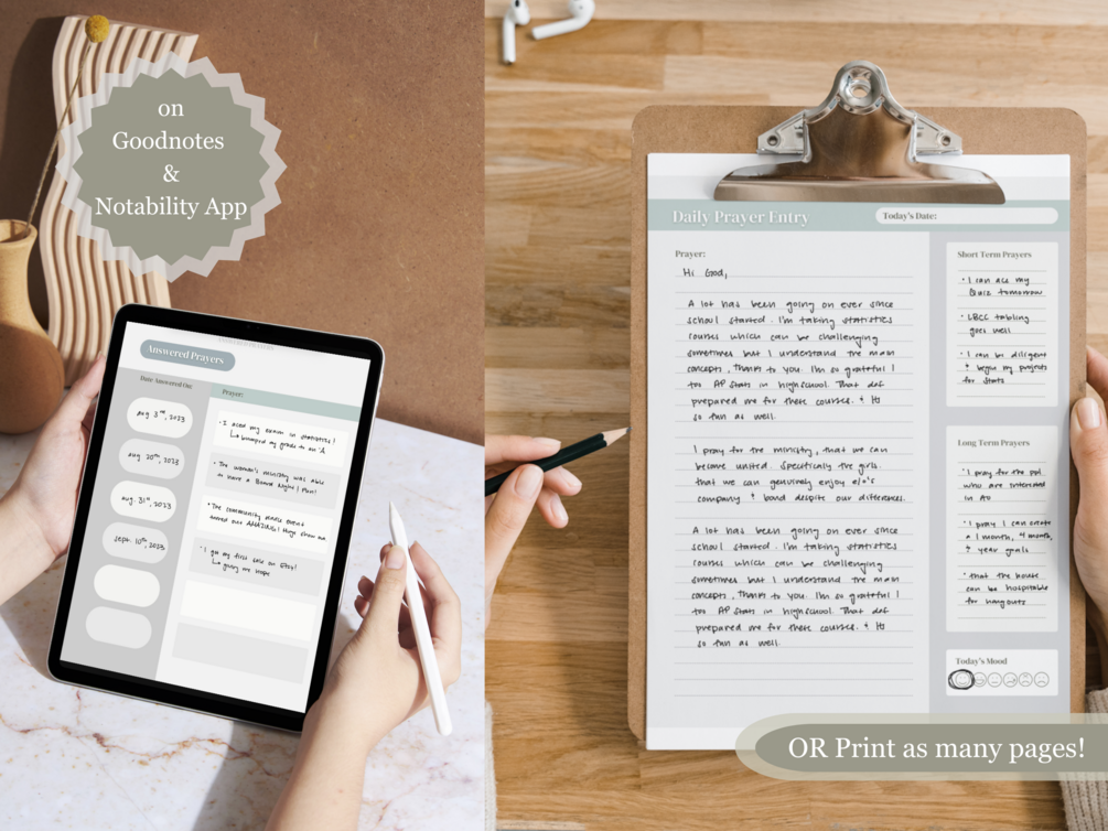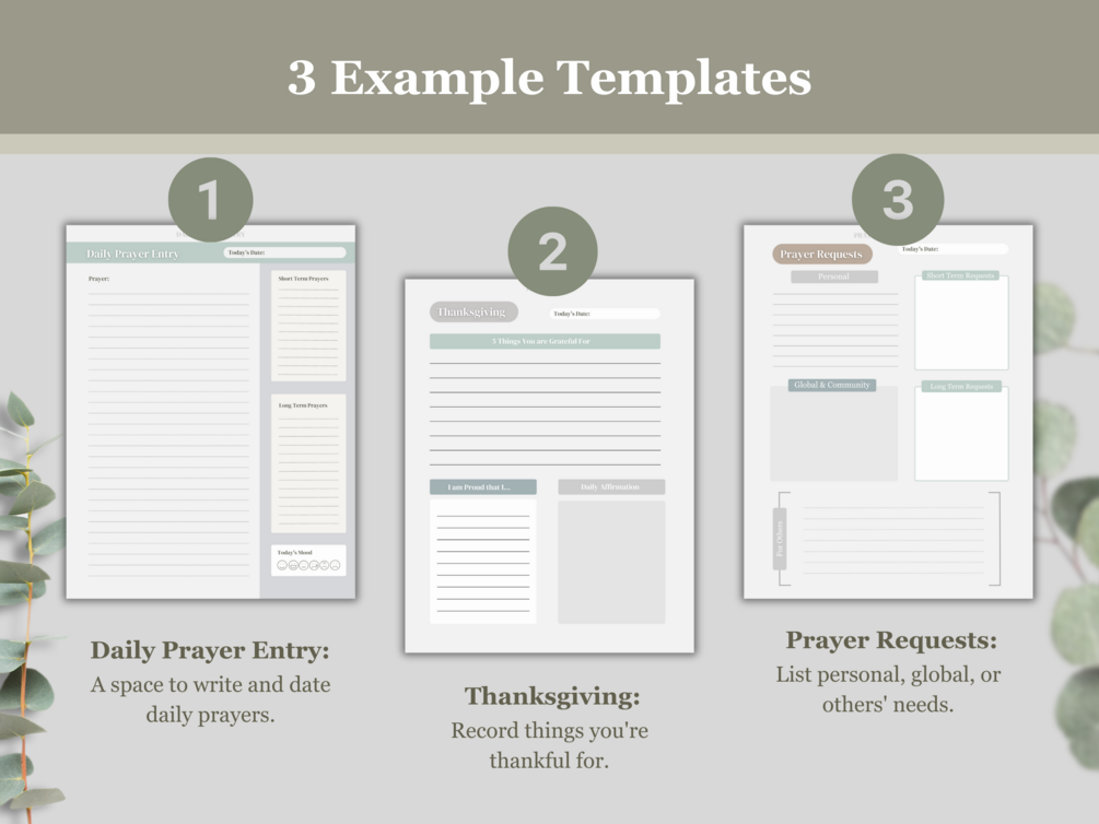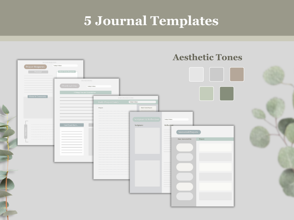You'll get Cover Name Personalization, "How to Use" Instructions page, and 5 Prayer Templates (Daily Prayer Entry, Thanksgiving, Prayer Requests, Scripture and Reflection, and Answered Prayers). PDF or Digital Ringed Journal.