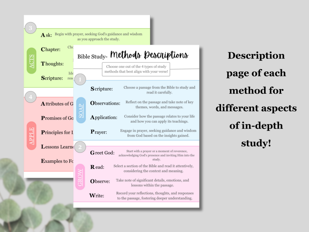 Unlock the transformative power of Scripture with this comprehensive bundle of four structured study methods: SOAP, ACTS, GROW, and APPLE. Compatible with GoodNotes, Notability, and other note taking apps. Print is also available. Dive deep into God's Word and discover new levels of understanding and relevance for your daily life.