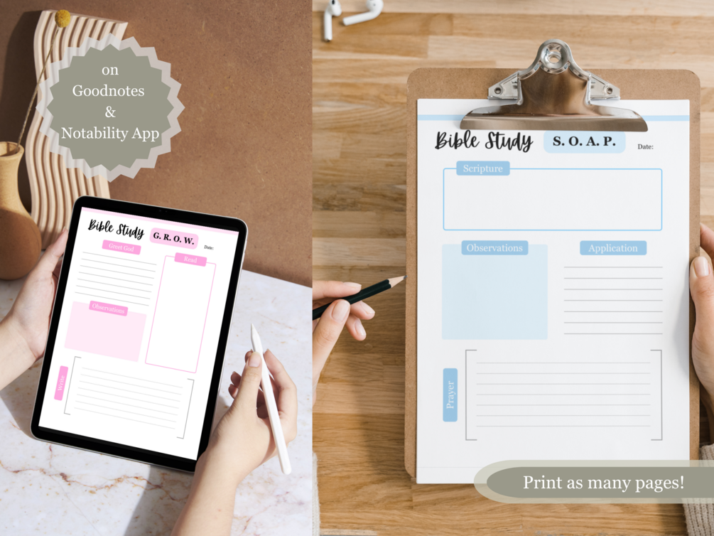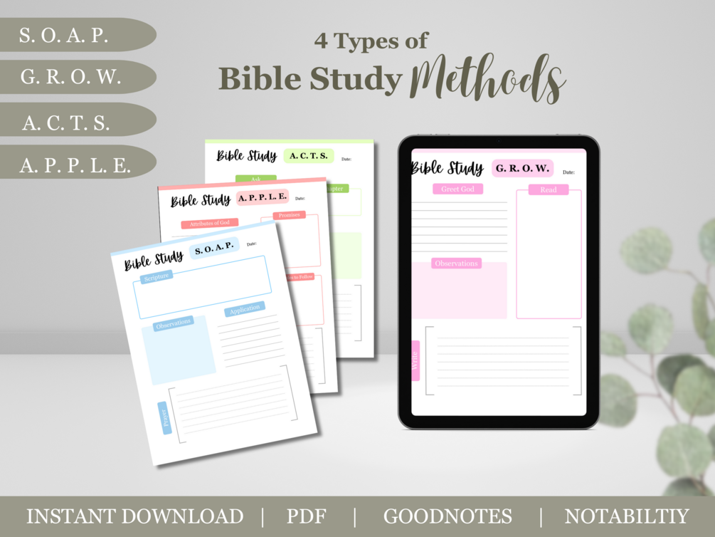 You'll get a comprehensive bundle of four structured study methods: SOAP, ACTS, GROW, and APPLE. Compatible with GoodNotes, Notability, and other note taking apps. Print is also available.